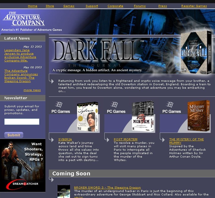 | Dark Fall: The Adventure Company Website: Upon release, the publishers featured the game on their official website. The above image is a screen capture of the website. Please note: The links don't work. It's just a picture. The website vanished many moons ago, hence the preservation on this page. |