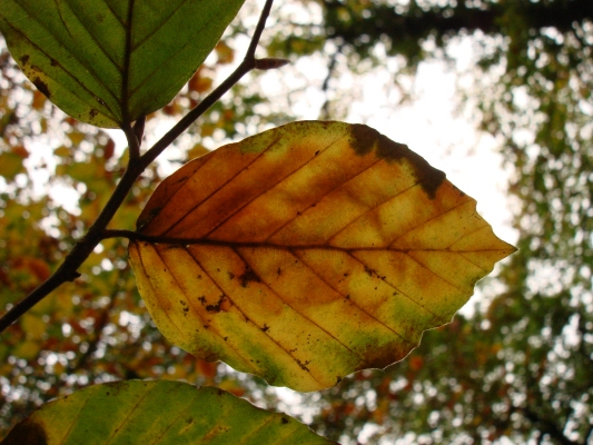 A rustic coloured leaf awaits the strong October winds to rip it from the tree.