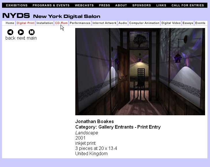 The New York Digital Salon presented “Landscape”, by Jonathan Boakes, in June 2001. Founded in 1993, the New York Digital Salon (NYDS) is one of the most established digital art exhibitions: "Digital art is truly an international art form. The democratizing effect of computers and the Internet have brought artists and cultures from around the world together in this annual event." |