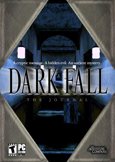 game. The four corner elements are captured from the hotel wallpaper (near kitchen setting), and the main image is of the second floor hallway. Notice also, that there is no quote from the JustAdventure+ review, and the tag lines are positioned atop of the main logo. Upon approval, further hi-res 3D renders were captured from the original game models, for use in the final design. See more designs in the Dark Fall section, here. |